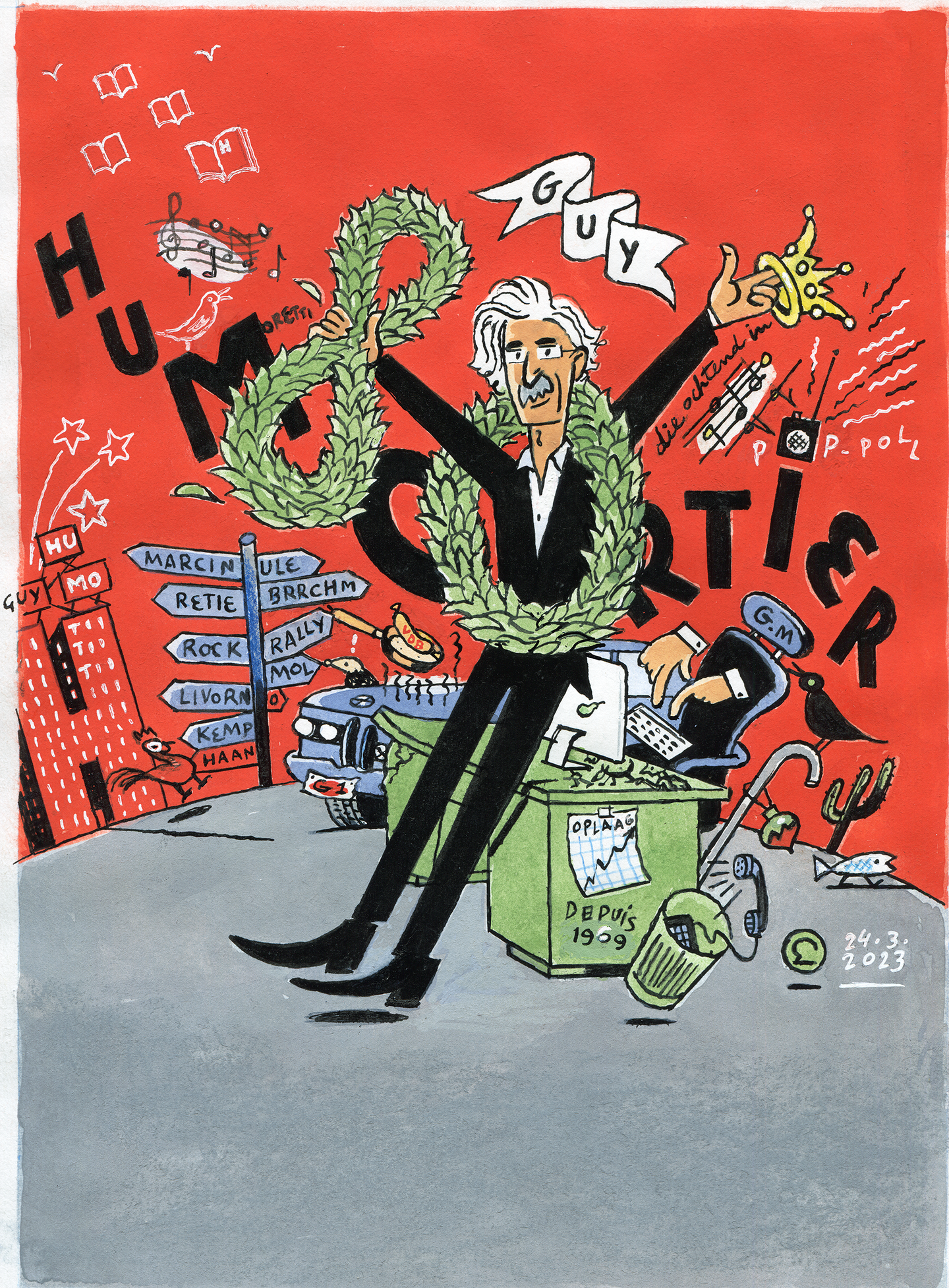 »The magazines we were sometimes compared to (Time Out, Rolling Stone, Les Inrockuptibles) no longer exist or have lost a lot of their lustre. Out of all those magazines, Humo is by far the most likely to have a long life. But maintaining our independence will be crucial. And we need lots of young people! Fortunately, I regularly see great pieces by new writers in Humo. And besides that: work hard and don’t give up!” He laughs. “And you need to be paid much better, of course. Here you should write: ‘The laughter has stopped. He is dead serious.’” The laughter continues.»