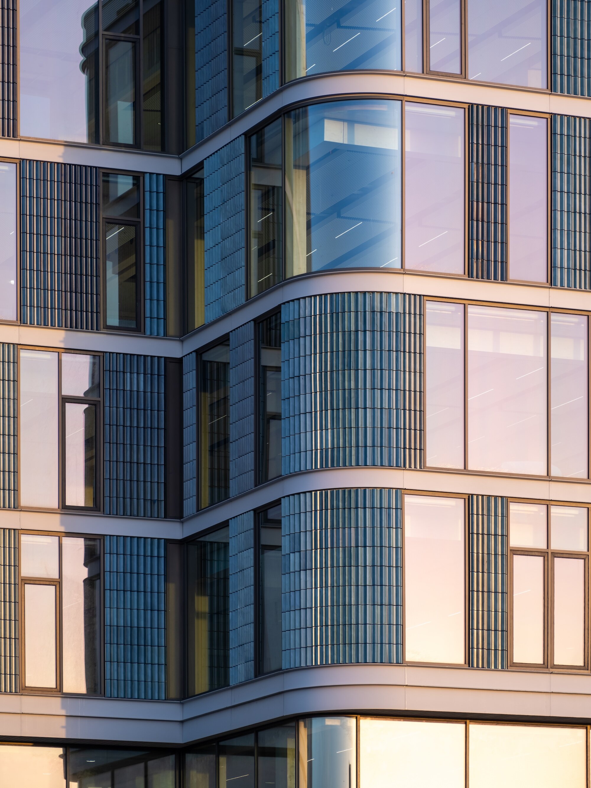 “Our assignment was to design a rugged building with a soft look. The softness is expressed through the use of lots of glass surfaces and flowing curves, which give the building a friendly feel, while the ceramic relief tiles in various shades of green and blue convey a sense of innovation and robustness. The building also has a dynamic shape: it’s not a single square structure, but three staggered sections with pitched roofs, connected by two atriums. Thanks to the wealth of greenery around the building and the landscape architect’s soft, rounded garden designs for the roof garden and terraces, there’s a green connection between the office and its environment as well. Employees who want to stretch their legs can go for a 430-metre stroll around the building through a raised garden, situated between the first and second floors.”
