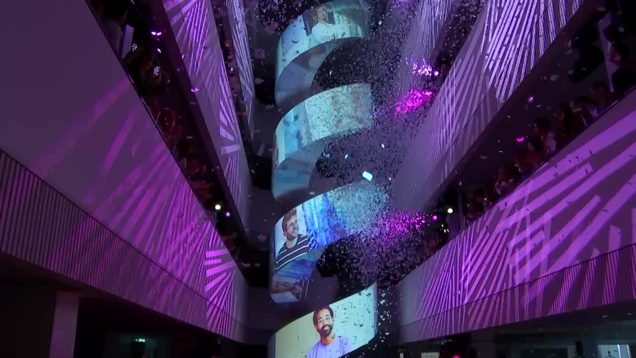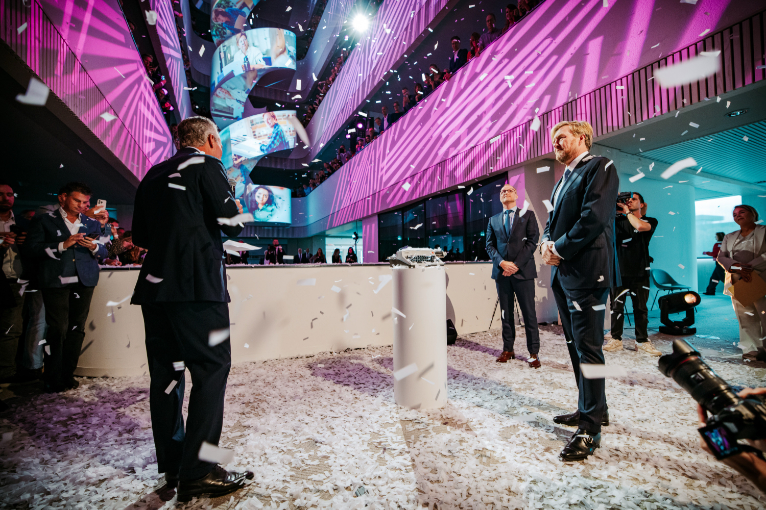 Opening show for Mediavaert. King Willem-Alexander opens Mediavaert by returning the carriage of a vintage typewriter. This starts a video presentation on the sculptural spiral staircase.