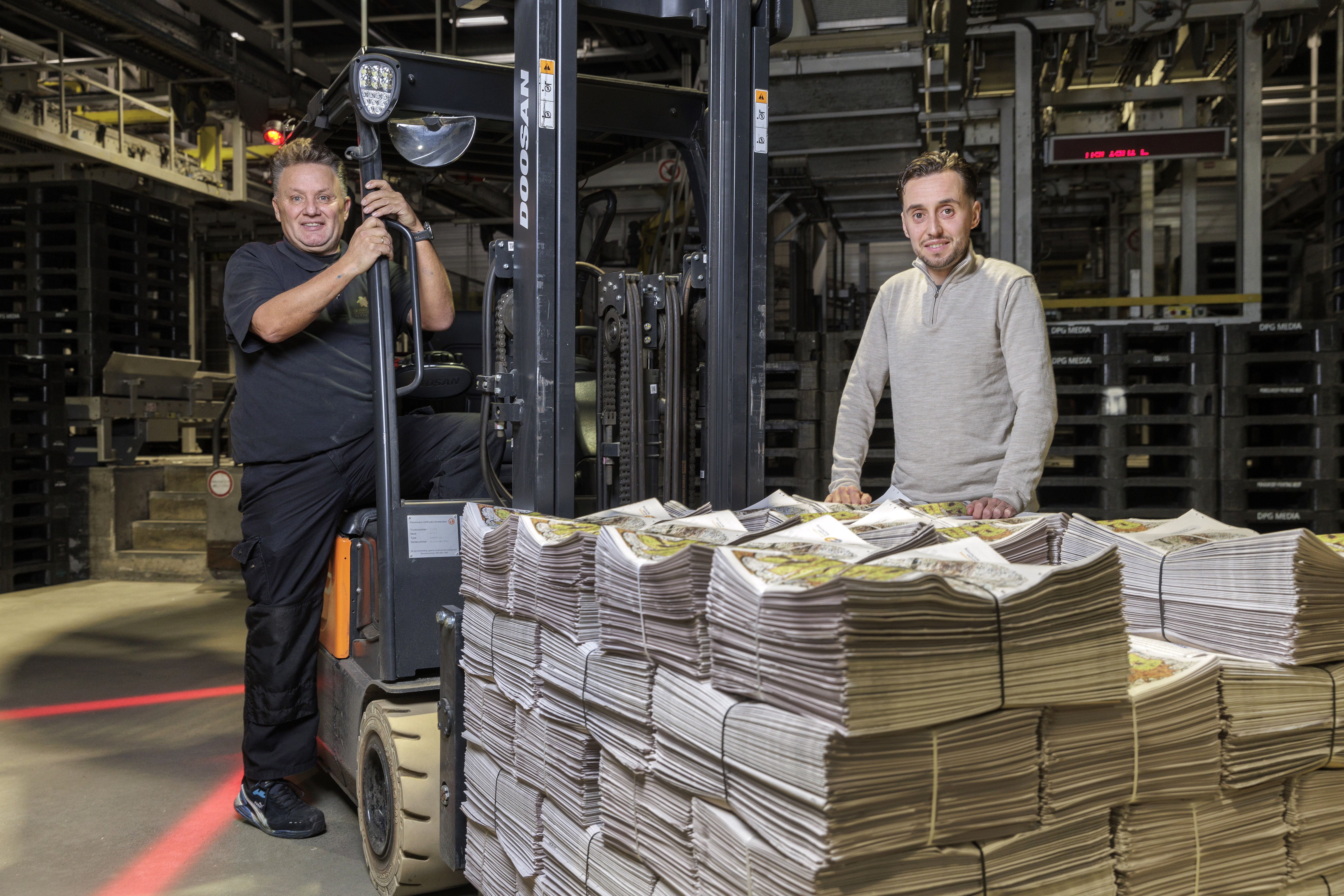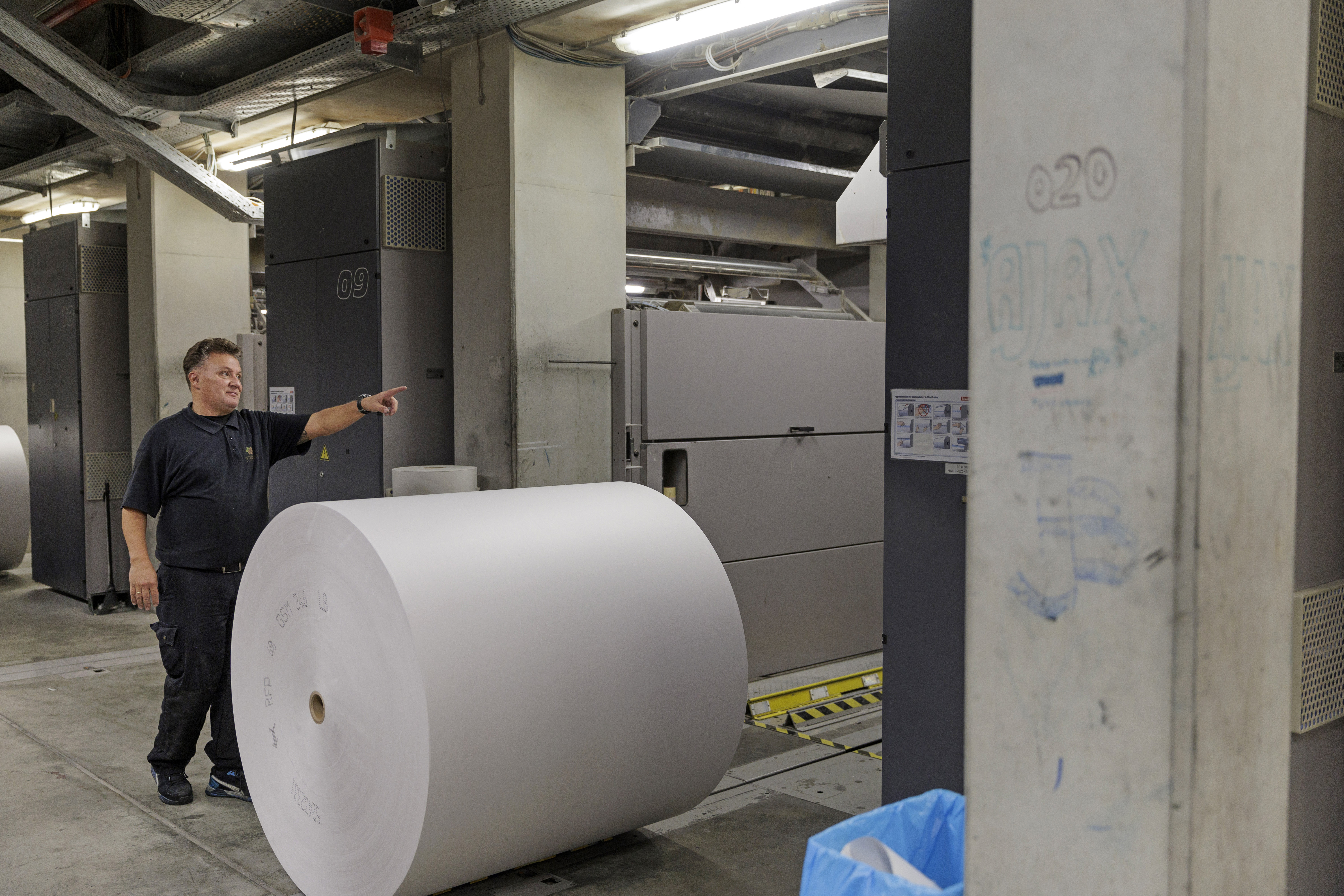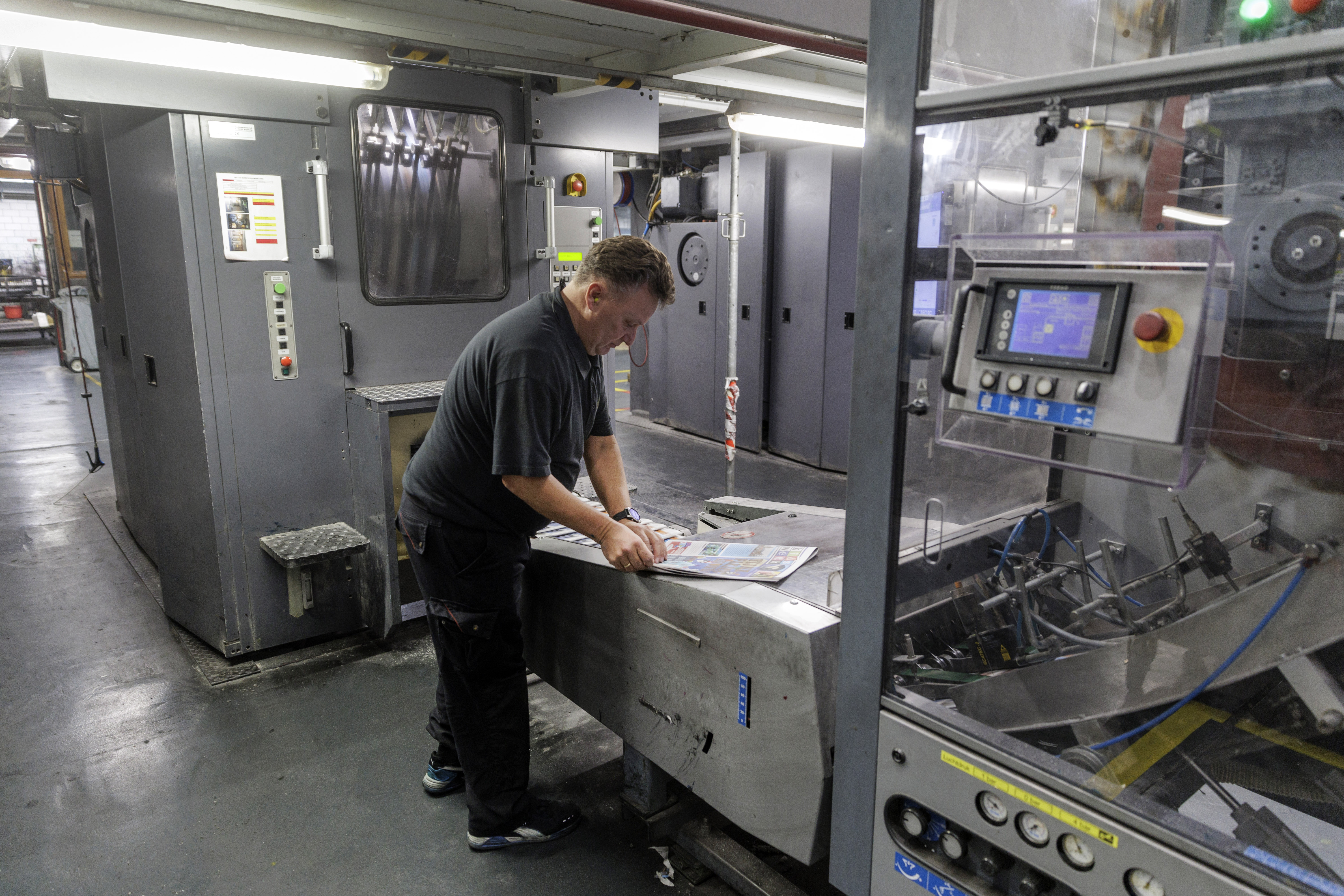 Oranje vestje aan, oordoppen in en binnen de aangegeven paden blijven: veiligheid staat voorop. Meerdere collega’s lopen gefocust en sjouwend met platen tussen immense rollen papier en machines die aan één stuk door draaien. Hier en daar hoor je ook gelach. “Ik ben nog nooit zonder plezier naar mijn werk gegaan”, vertelt Peter.