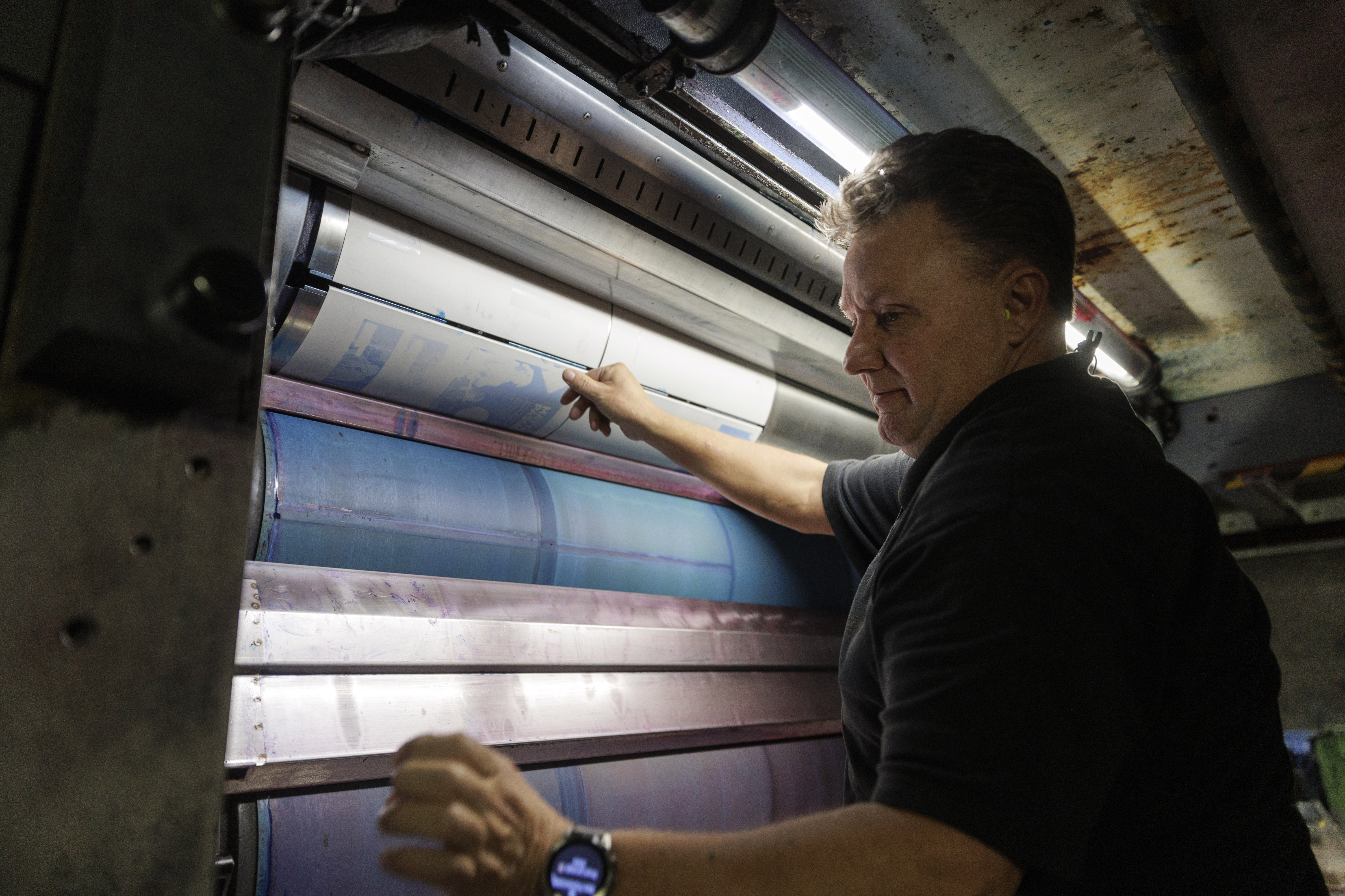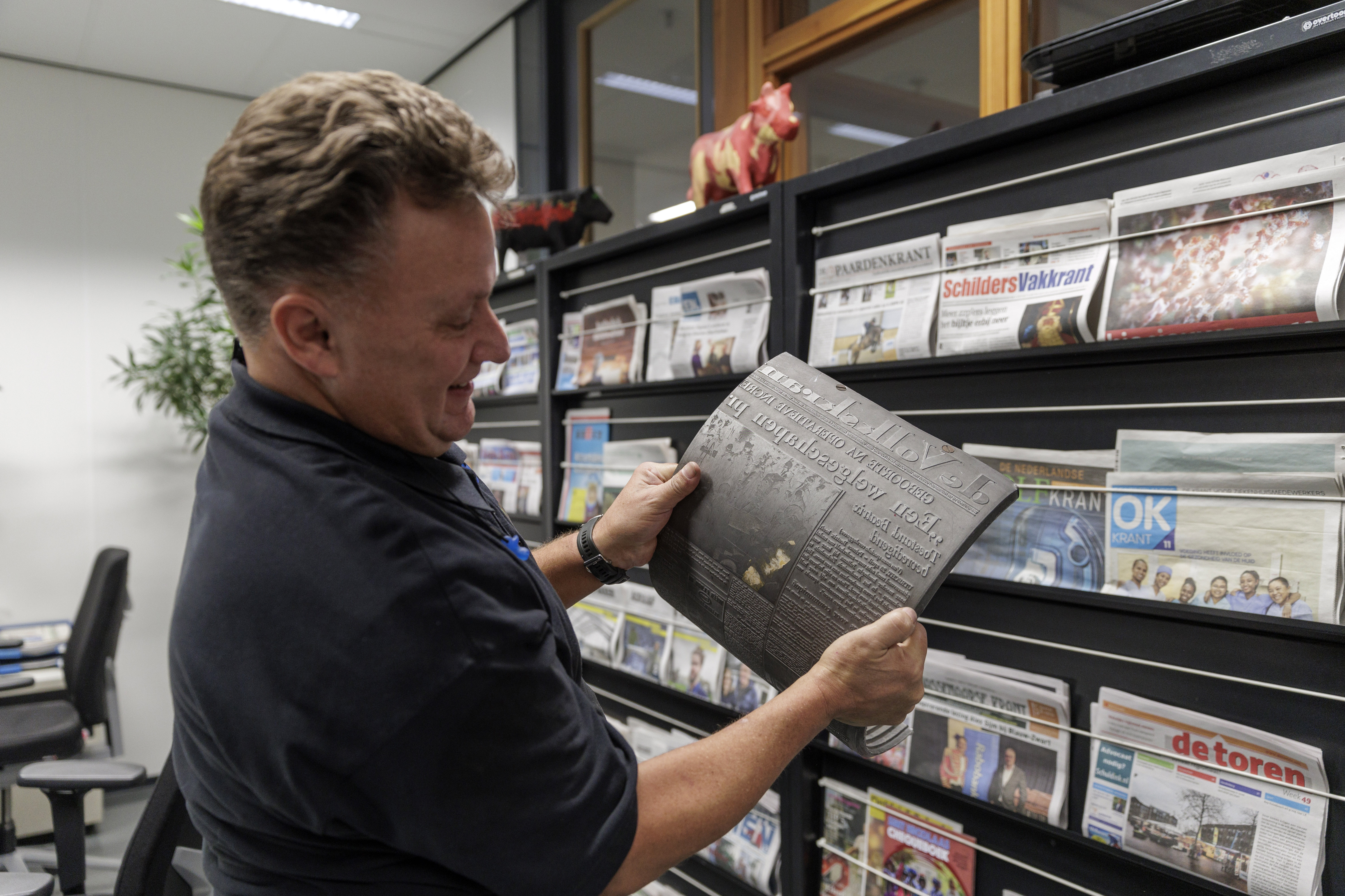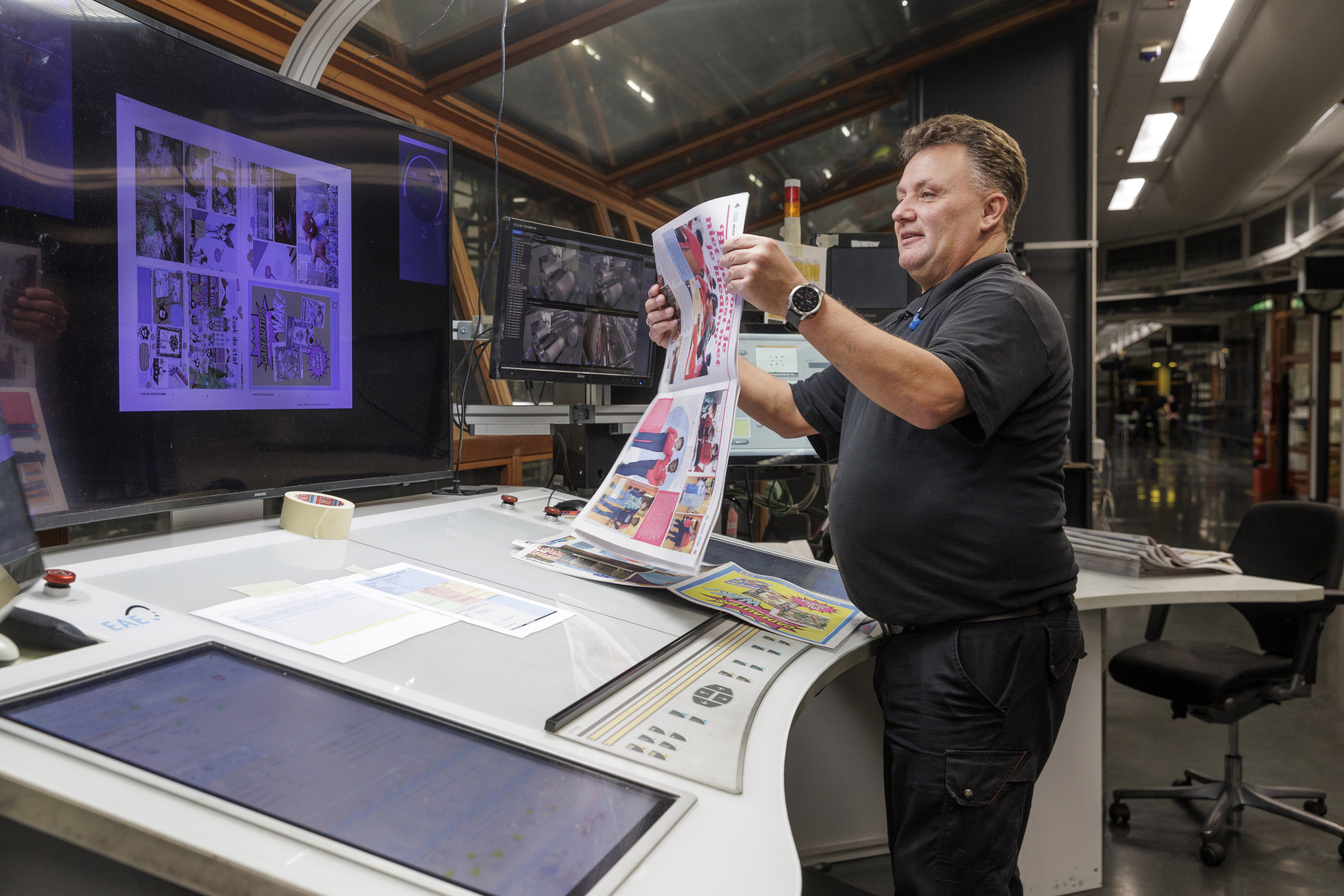 Oranje vestje aan, oordoppen in en binnen de aangegeven paden blijven: veiligheid staat voorop. Meerdere collega’s lopen gefocust en sjouwend met platen tussen immense rollen papier en machines die aan één stuk door draaien. Hier en daar hoor je ook gelach. “Ik ben nog nooit zonder plezier naar mijn werk gegaan”, vertelt Peter.