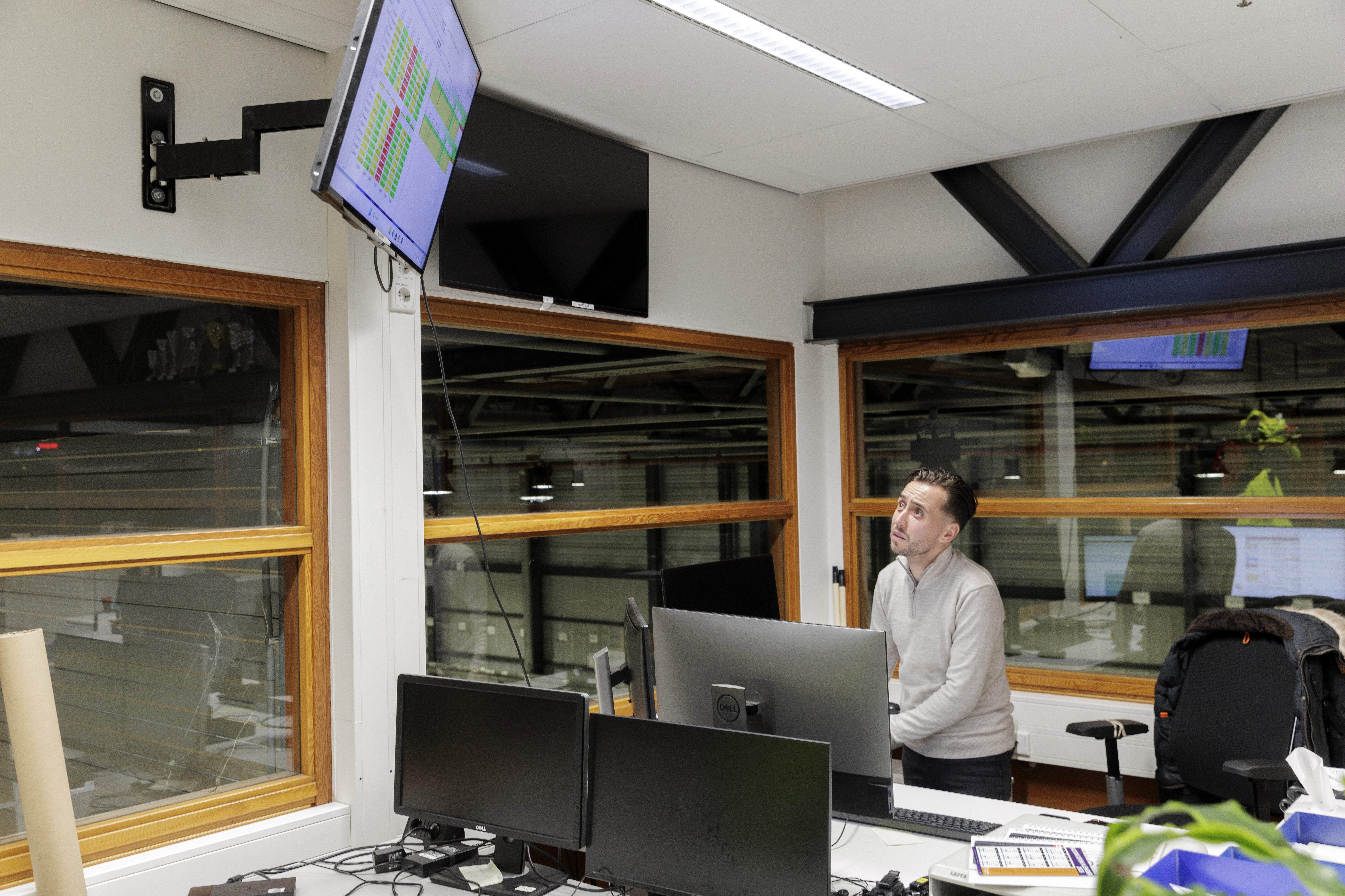 In de distributiehal op de eerste verdieping zit Jordy. “Hier heb ik perfect zicht over alle vrachtwagens die in- en uitrijden, tientallen per nacht.” Jordy was als kind al gefascineerd door het werk van zijn vader en ging ook weleens mee. Op zijn zeventiende kreeg hij hier zijn eerste bijbaan, weekendbijlagen bij kranten voegen. “In dertien jaar ben ik doorgegroeid tot transportleider.”