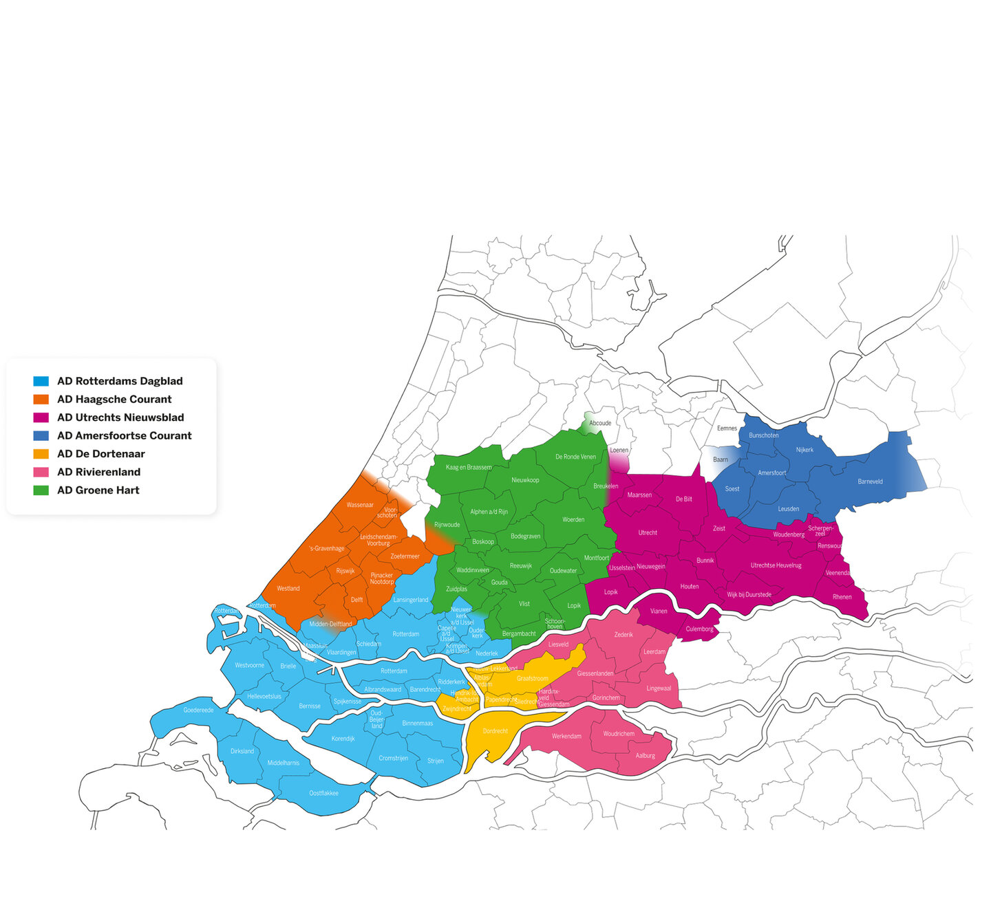 De zeven regionale titels (AD Rotterdams Dagblad, AD Haag­sche Courant, AD Utrechts Nieuwsblad, AD Groene Hart, AD De Dordte­naar, AD Amersfoortse Courant en AD Rivie­ren­­land) zijn sindsdien een apart bedrijfs­onderdeel: AD Regio. Op vijf locaties in de grote steden van de Randstad worden in print 17 regionale edities gemaakt; 85 procent van de krantenlezers krijgt een regionale AD-titel. Daarnaast maken we digitaal de verhalen voor tientallen gemeentepagina’s, regionale video’s, podcasts en nieuwsbrieven.