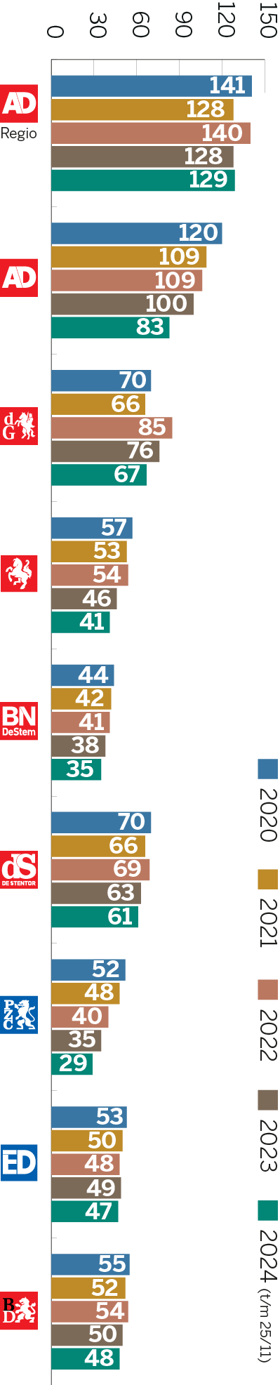 The seven regional brands (AD Rotterdams Dagblad, AD Haagsche Courant, AD Utrechts Nieuwsblad, AD Groene Hart, AD De Dordtenaar, AD Amersfoortse Courant and AD Rivierenland) have since become a separate business unit: AD Regio. At five locations in the major cities in the Randstad region, 17 regional editions are printed; 85% of the newspaper readers read a regional AD paper. In addition, we digitally supply the stories for dozens of municipal pages, regional videos, podcasts and newsletters.