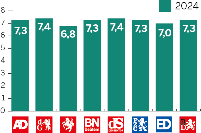 Dit cijfer is afkomstig uit recent onderzoek naar merkvertrouwen in opdracht van DPG Media. Daarbij geeft een algemeen publiek, dus niet alleen abonnees of bezoekers, vertrouwen in verschillende nieuwsmedia aan op een schaal van 0 (helemaal niet betrouwbaar) tot 10 (uiterst betrouwbaar). Daarnaast worden abonnees uitgesplitst, die hun titel doorgaans meer dan gemiddeld vertrouwen. Deze onderzoeksmethode en de uitkomsten komen overeen met die van het jaarlijkse Digital News Report van het Reuters Institute in Oxford. De Nederlandse en Vlaamse gemiddelde vertrouwenscijfers liggen in die monitor hoger dan die van nieuwsmedia in de omringende Europese landen.
