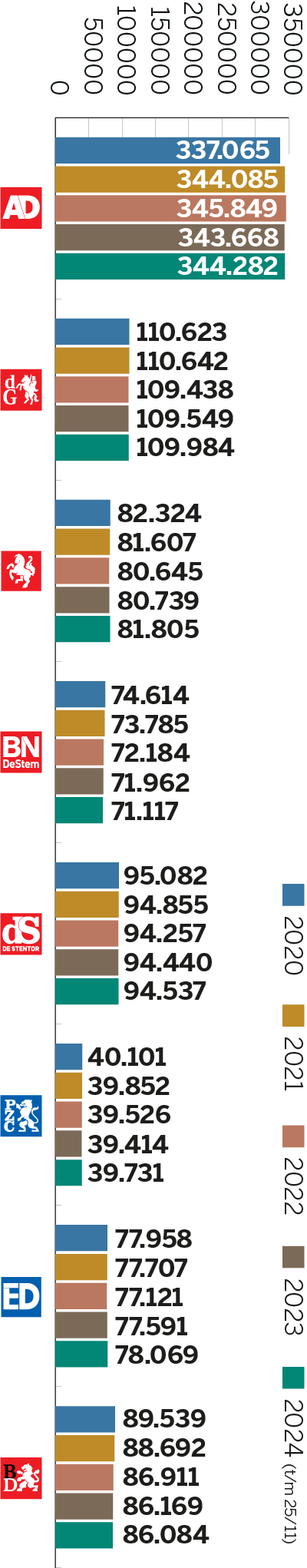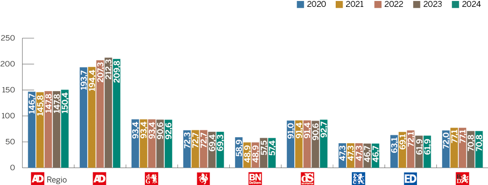 Dit is de som van papieren, digitale en hybride abonnementen. Het is het gemiddelde aantal over het desbetreffende jaar.