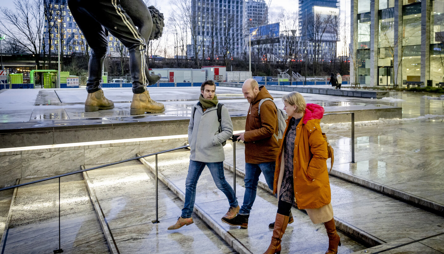 Verslaggevers Chiel Timmermans (l) en Yelle Tieleman (m) verlaten samen met hoofdredacteur Rennie Rijpma (r) de rechtbank na afloop van het kort geding.